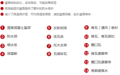 作為傳統(tǒng)屋面通風(fēng)方案的優(yōu)化,鋁箔墊層的加入,使反射鋁箔與嵌入順水條間的保溫板形成空氣間層,代替了部分保溫板厚度,而且省去了保溫保護層。